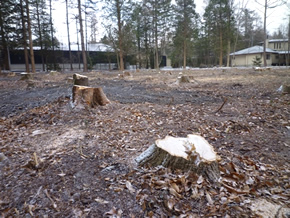 昨年帰国し、6年ぶりに軽井沢の別荘にやって来た川田美枝子さん(仮名)は、別荘の周辺の変わりように驚いた。田崎美術館の前にあった林は全部切られ、大きな切り株がたくさん残されていた。数えてみると100本近い。土地分譲の看板が掲げられているが、売るなら別に全部切る必要はないのに、と悲しくなった。【要綱第4条】町民等及び事業者は、自然環境の保護及び良好な景観の形成に自ら努めるとともに、町がこの条例の目的を達成するために行う施策に協力しなければならない。(条例の目的とは、自然環境及びそれによる景観を保護し、明るく健康的な国際保養地としてのまちづくりに寄与すること、と第1条に書かれている。)