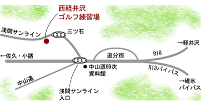 軽井沢駅より20分、国道18号、浅間サンライン入口入る。 浅間サンライン沿い 車約1分。 佐久平駅より車20分。