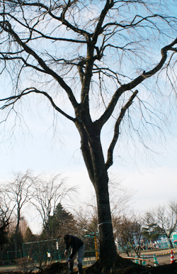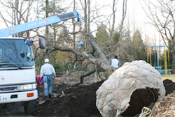 2007年12月○日 雪が降る寒い日、しだれ桜を掘り起こし、離山通りのホテル「ロンギングハウス」の庭へ運びました。樹齢50年以上と思われる大樹だけに、その根の大きいこと。運ぶには制限があるため、たくさん枝を切らなくてはならないのが気の毒でした。でもだいじょうぶ、きっと春にはまた枝が出てきて来年の春には美しい花を咲かせることでしょう。