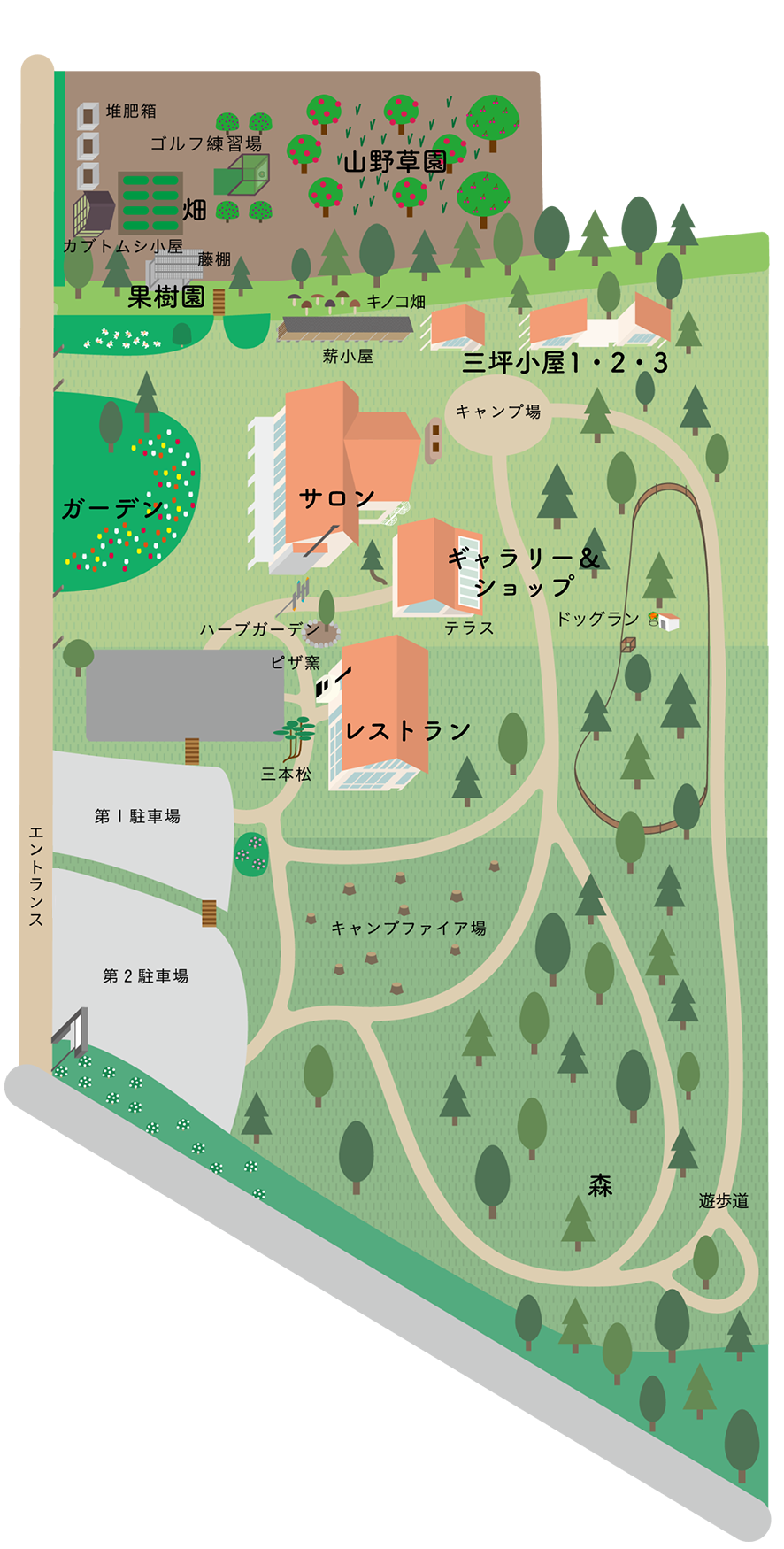 2500坪の広大な敷地に、サロン、ギャラリー&ショップ、レストラン、巨大石窯、薪小屋、三坪小屋、農園、藤棚、ミニゴルフ練習場、カブトムシ小屋、ドッグランが点在しています。