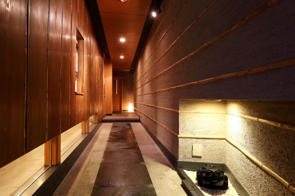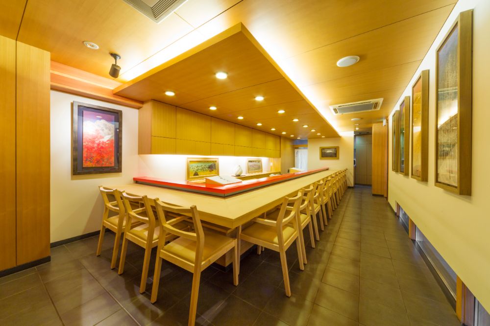 天然木曽檜の一枚板カウンターが目を引く店内。