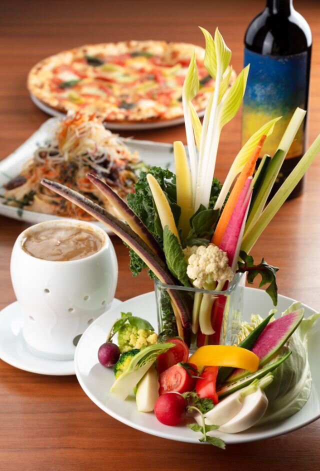 珍しい野菜が並ぶバーニャカウダや、信州食材たっぷりの生パスタ、フレッシュトマトと水牛モッツァレラのピッツァなど、旬の恵みを味わい尽くそう。