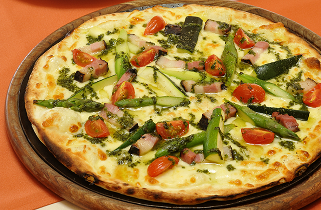 お店自慢の、鉄板ごとオーブンで焼き上げる「あつあつ鉄板ピッツァ」は表面は薄くカリッと、中はモッチリとしている。