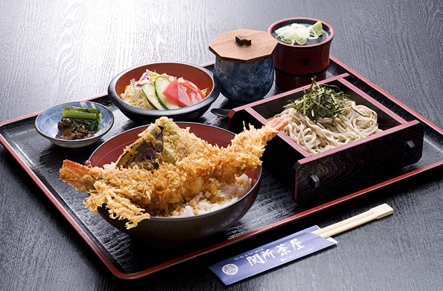 天丼スペシャル (有頭エビ天丼、小ざるそば、茶碗蒸し、サラダ、おしんこ)