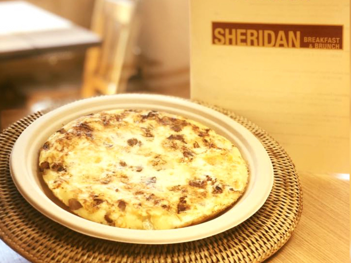【パネクッケン】Pannekoeken 1,280円 / 約22cm シカゴスタイル・ダッチパンケーキ (パンケーキの生地の中に、自家製ベーコン、玉ねぎ、目玉焼き入り) 一人前のサイズだが、ピザの様にカットしてシェアできる。テイクアウトメニューの詳細はFacebookページをチェック。