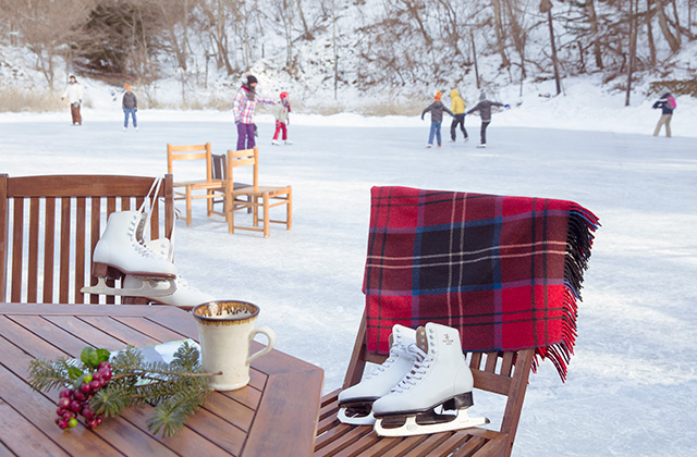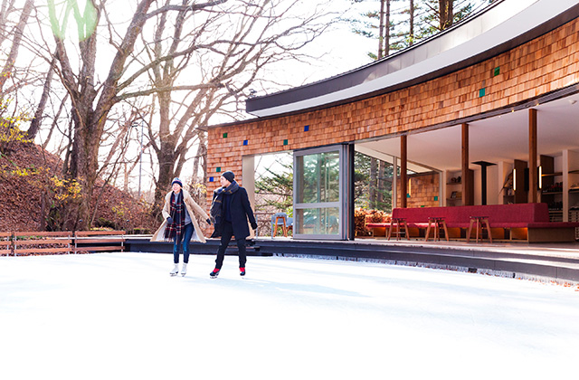 森から流れ出る沢の水を利用したひょうたん型の「ケラ池」が、凍ってスケートリンクに。
