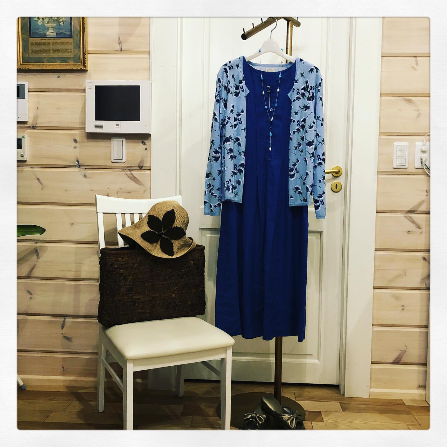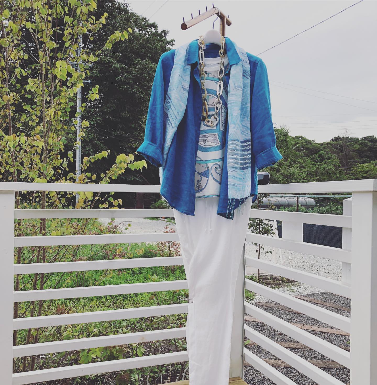 フランスのオーガニックのブルーの麻・エジプト綿のTシャツを合わせてみました。