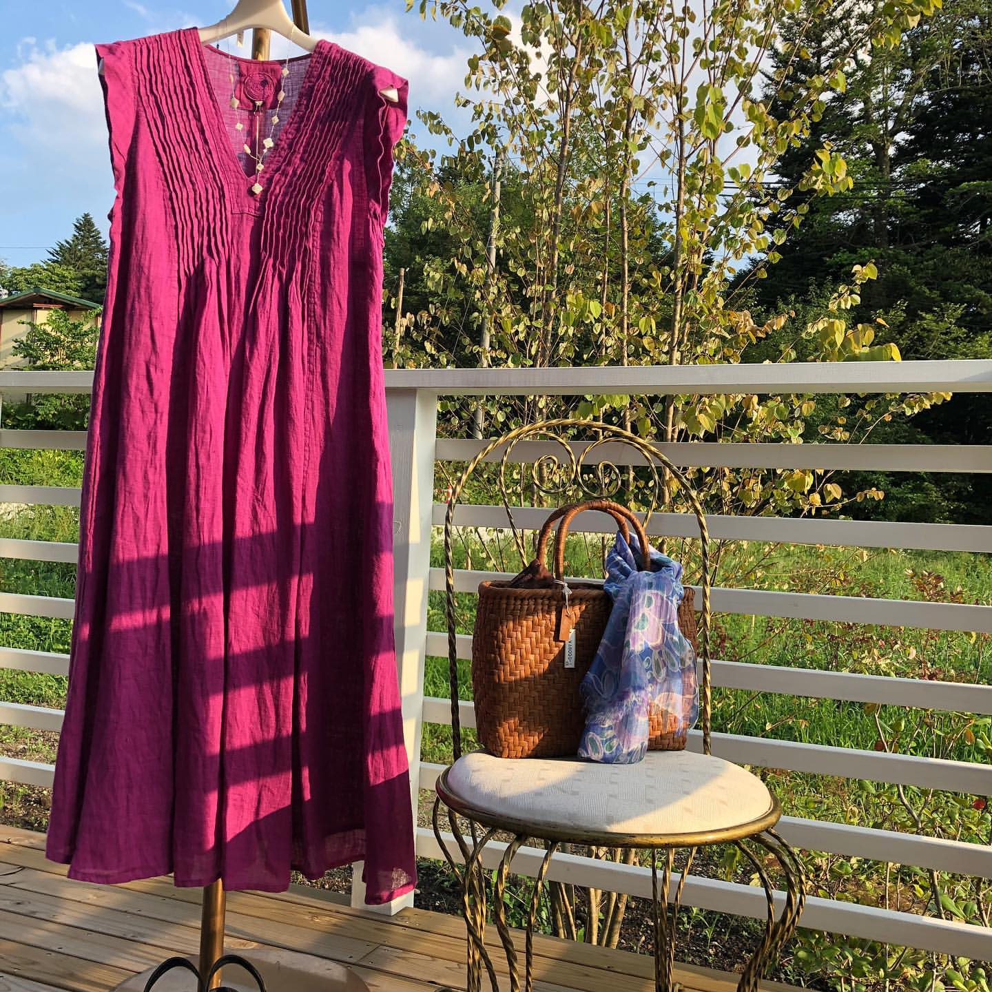 フランスのオーガニックの麻のワンピースです。深いショキングピンクの色が個性的な雰囲気を感じます。
