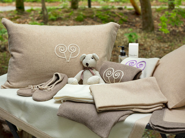 モンゴル直送の厳選カシミヤを使用したウェアやファブリックが揃う。通気性と保温性に優れたカシミヤは、湿度が高く涼しい軽井沢の気候にぴったりの天然素材で、カーディガンやニットは年間通して着用できる。おうち時間が増えている今おすすめしたいのが枕やクッションカバー。マシュマロのような肌触りで、よりリラックスした時間を過ごせそう。