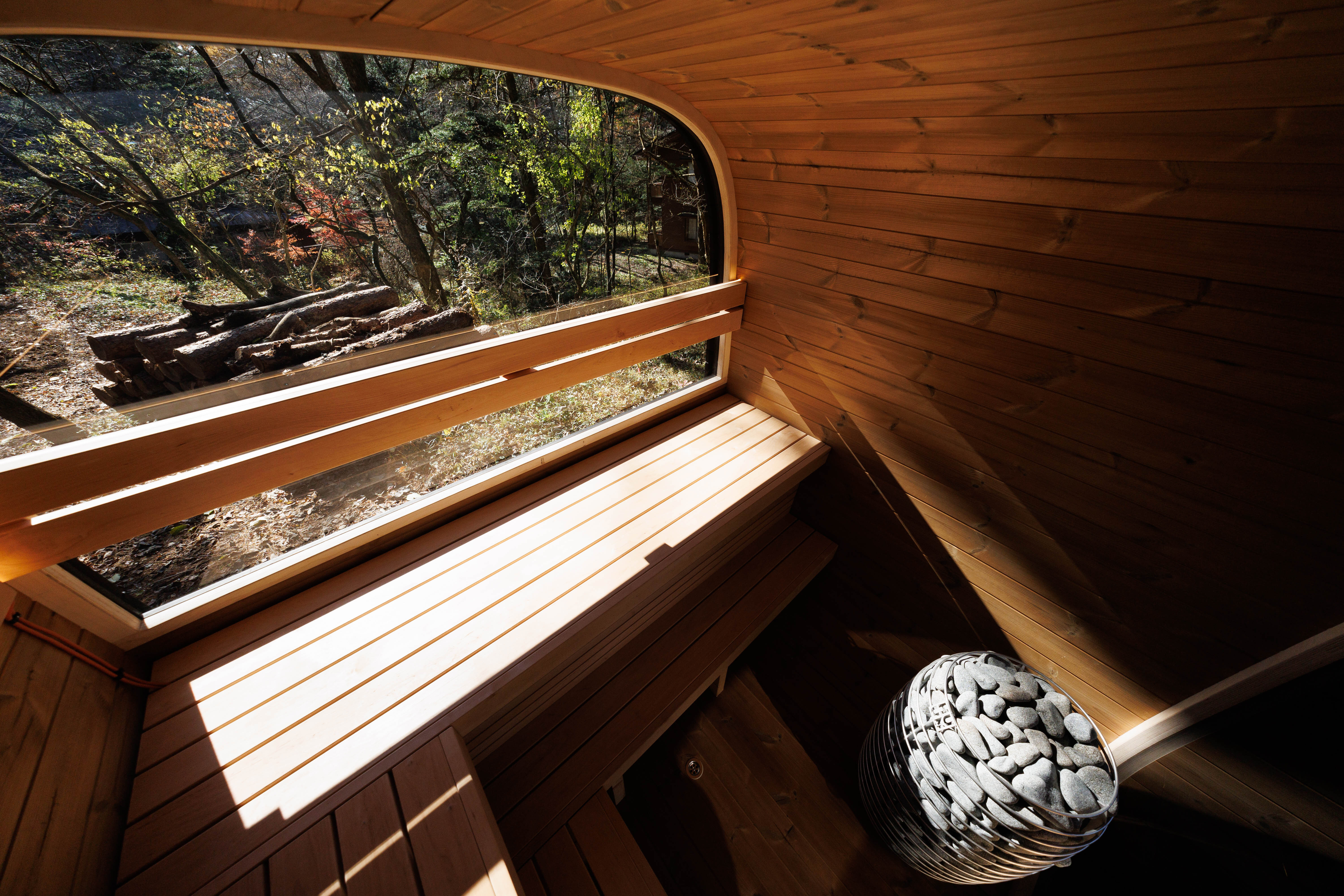 木の温もりを感じるサウナキャビンでは、ストーンから発せられるマイルドスチームで体感温度を上げるので、窓の外を眺めたり、友人と語らいながらリラックスしたり、至福の時間を過ごすことができる。