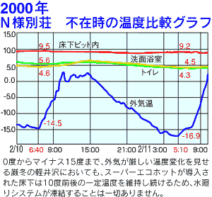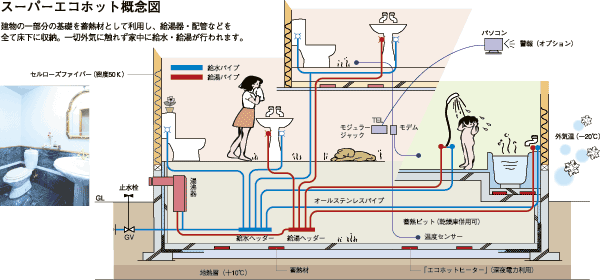 しかし、新システム「スーパーエコホット」はそれらの面倒な問題を一挙に克服。給湯器や水道管など全ての配管を屋内に収納、深夜電力や地熱を用いて床下を蓄熱することで、水回り全てを凍害から守ります。コンクリートや特殊蓄熱材を用いた床下ピット内は外気温が−20℃を下回っても、常に10度前後。