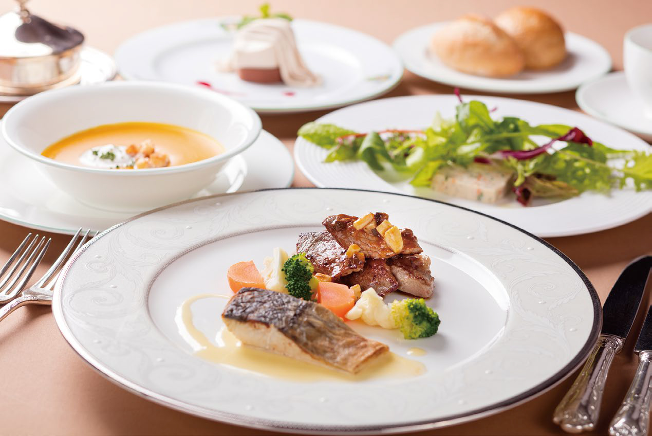創業から123年、伝統のレシピを受け継ぎながら、時代に合わせて進化してきたフレンチのコースやアラカルトを味わえるメインダイニング。おすすめは、彩り豊かな春野菜のサラダや、野菜のポタージュ、肉と魚の盛り合わせのメインが付く「春の軽井沢スペシャルランチコース」。カフェタイムはジョン・レノンがオーダーした信州りんごのアップルパイ、ロイヤルミルクティーを味わいに、カフェテラスへも足を運びたい。