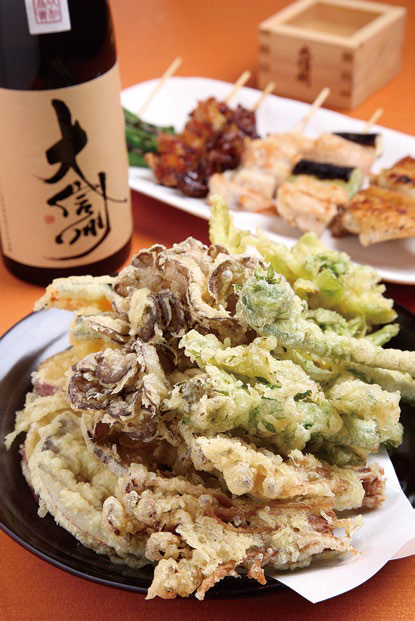 やきとり盛り合わせ(972円)や季節の山菜天ぷら(735円)などメニュー多数