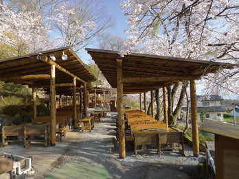 桜の下でお花見バーベキューも。全テーブル屋 根付きだから安心。