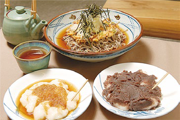 1855年に行われた遠足(とおあし・日本で最初のマラソンのルーツ)の賞品にもなったちから餅。昔ながらの手作りの味に根強いファンが多い。風味豊かな蕎麦もおすすめで、浅間おろしそばや、大きなエビ天がついた「特大海老天ざるそば」は食べ応え十分。