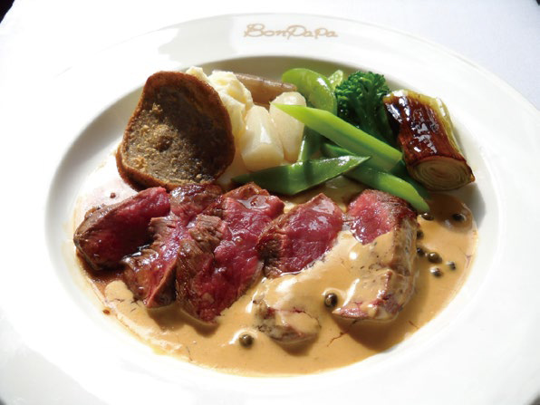 - メインディッシュの一例 牛赤身熟成肉のロティ、 二色のソース 旨み濃厚な熟成肉を、シンプルなフォンと生胡椒のクリームソースで