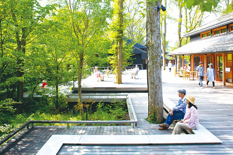 大きなハルニレの木々に囲まれ、清流・湯川が流れる街並みに、軽井沢ライフを豊かに彩るレストランやカフェ、ライフスタイルショップなど15の個性的な店舗が並ぶ。