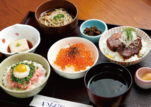 小どんぶり味三昧1,900円。いくら・角煮・ネギトロと三種の味が楽しめる。