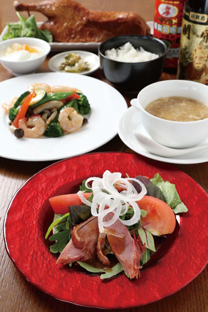 いつも多くの客で賑わう本格広東料理店。毎年大好評の「8月限定ランチセット」を今年も提供。パリパリの皮が香ばしい北京ダックのサラダ、フカヒレたっぷりのスープ、日替わりの一皿などがついて食べ応え満点。種類豊富な焼きそば