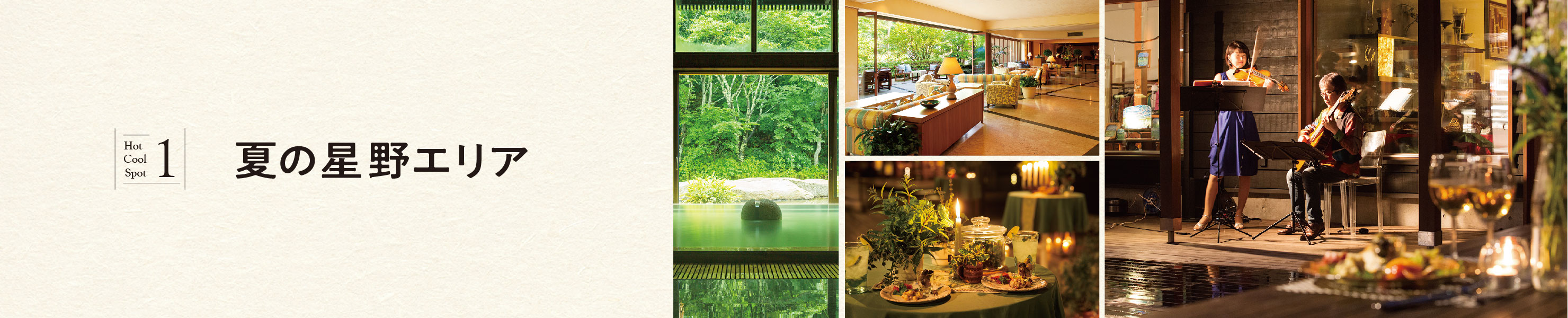 星野エリアサロン 軽井沢アペリティフサロン 7/20~8/5( 金・土・日)TEL:0267-45-5853 夕暮れ時の涼しいそよ風が感じら れるハルニレテラスで、アペリティ フ(食前の飲み物)とアペタイザー (食前のおつまみ)を楽しめる。バイ オリ... 詳しくみる