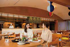 - 食事の他、喫茶・バーと しても利用できるレス トラン。20時半からお 酒とつまみがセットに なったお得メニューも。