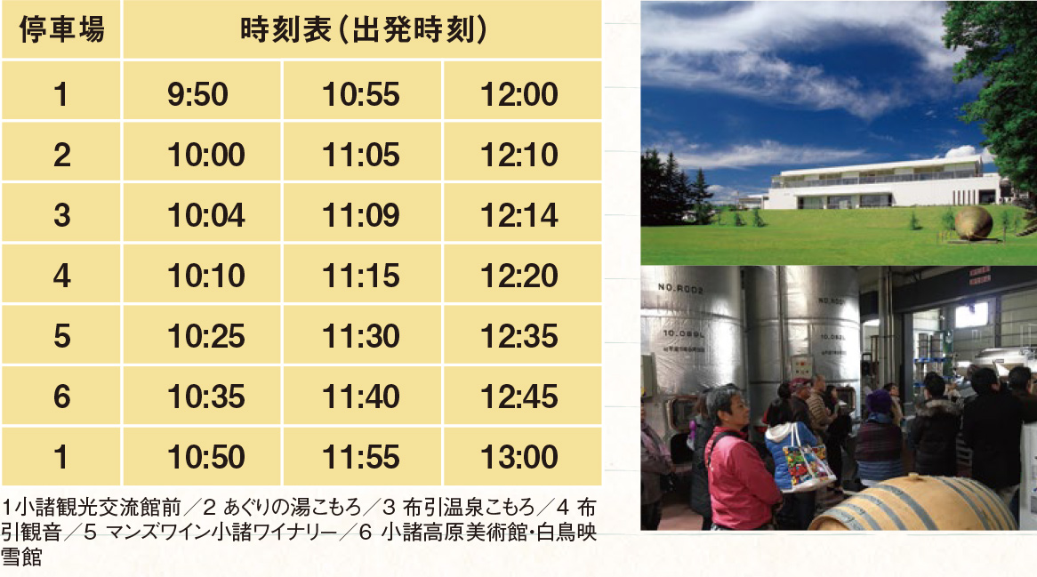小諸バスツアー ⑨ バスツアーで名所巡り。 11月25日(日)までの週末、小諸の人気スポットをバスでめぐるツアーを開催中。9時50分発のバスに乗車して、プランを考えよう。 期/11/25(日)までの土・日・祝料/1,500円