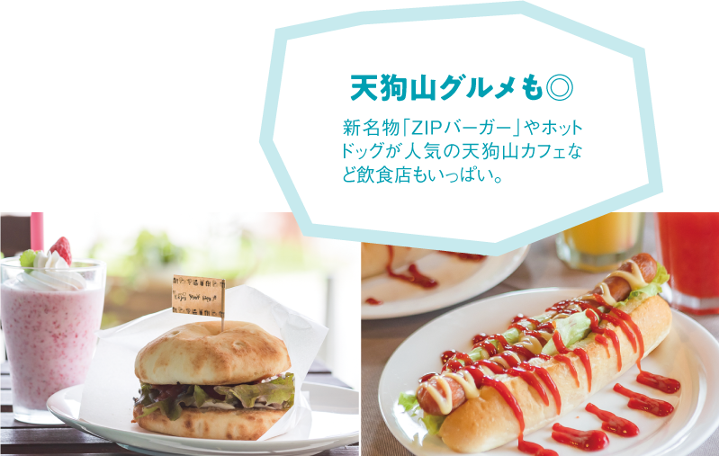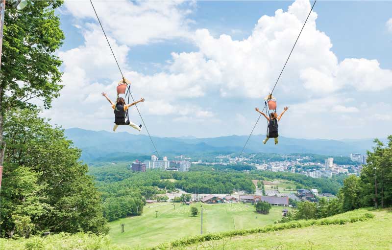 様々なアクティビティが楽しめる天狗山プレイゾーン。ハーネスを装着して5mの大ジャンプや回転が楽しいスカイトランポリン、親子で楽しめるマウンテンカートは、若者やお子様連れ家族に大人気。大勢でワイワイ楽しみたい。