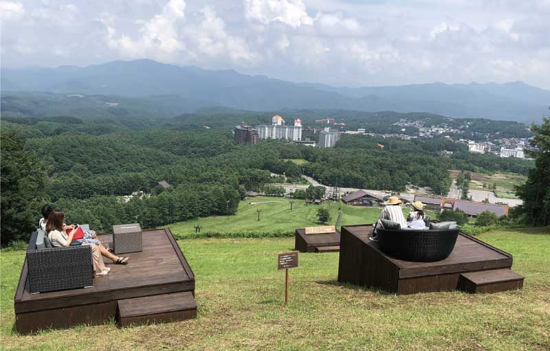 リフトに乗って天狗山山頂へ。標高1,300mを超えるテラス(利用無料)から、草津温泉街を見下ろせる。斜面に設置したソファで、ゆったりと。
