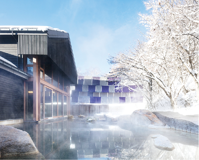 日本有数の大露天風呂。森林に囲まれた大きな湯船に浸かれば、日々の疲れも癒やされる。冬は雪見でゆったりと。