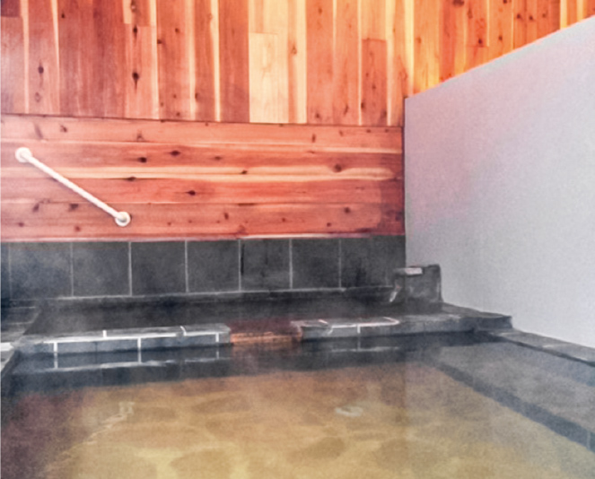 鹿沢温泉雲井の湯から引湯している、琥珀色の湯の花が漂う源泉掛け流し温泉。