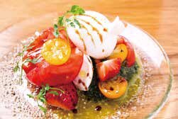 色鮮やかなフルーツトマトとクリーミーなブッラータをこだわりのバジルソースで味わうカプレーゼ(2,420円)。