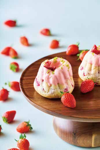 ショーケースに並ぶのは地元産の苺を使った春の新商品クグロフ、ミルクフラン スなど。テイクアウト利用もOK。
