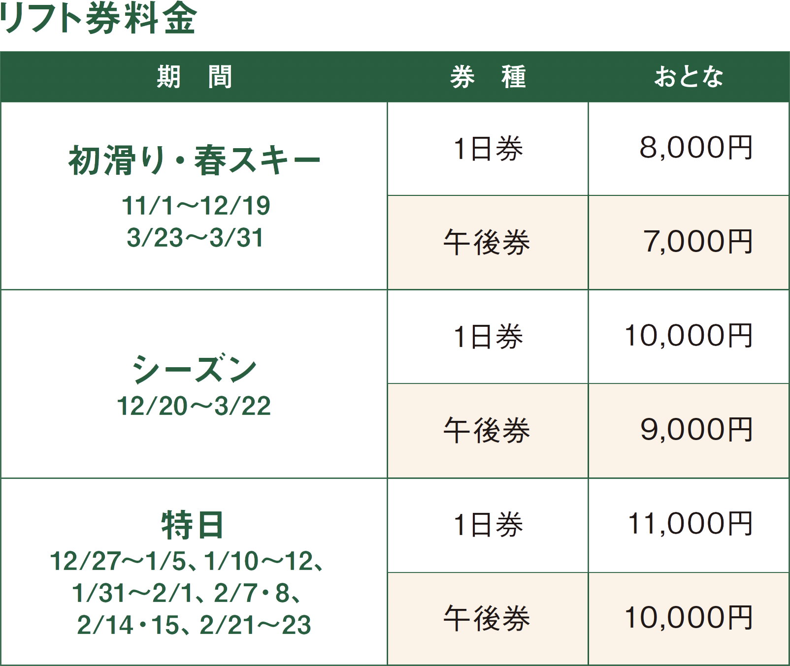 ※小学生までのリフト券は無料。未就学児のリフト 乗車は保護者同伴。 ※午後券は12:00NOONから使用可能。