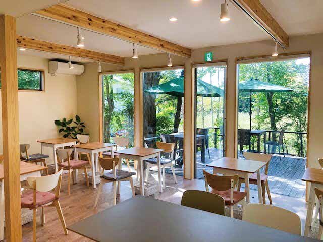 自然に囲まれた軽井沢らしいロケーション。広い テラスはワンちゃんもOK。 季節や天候によっては店内 も一部可。
