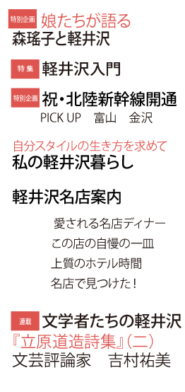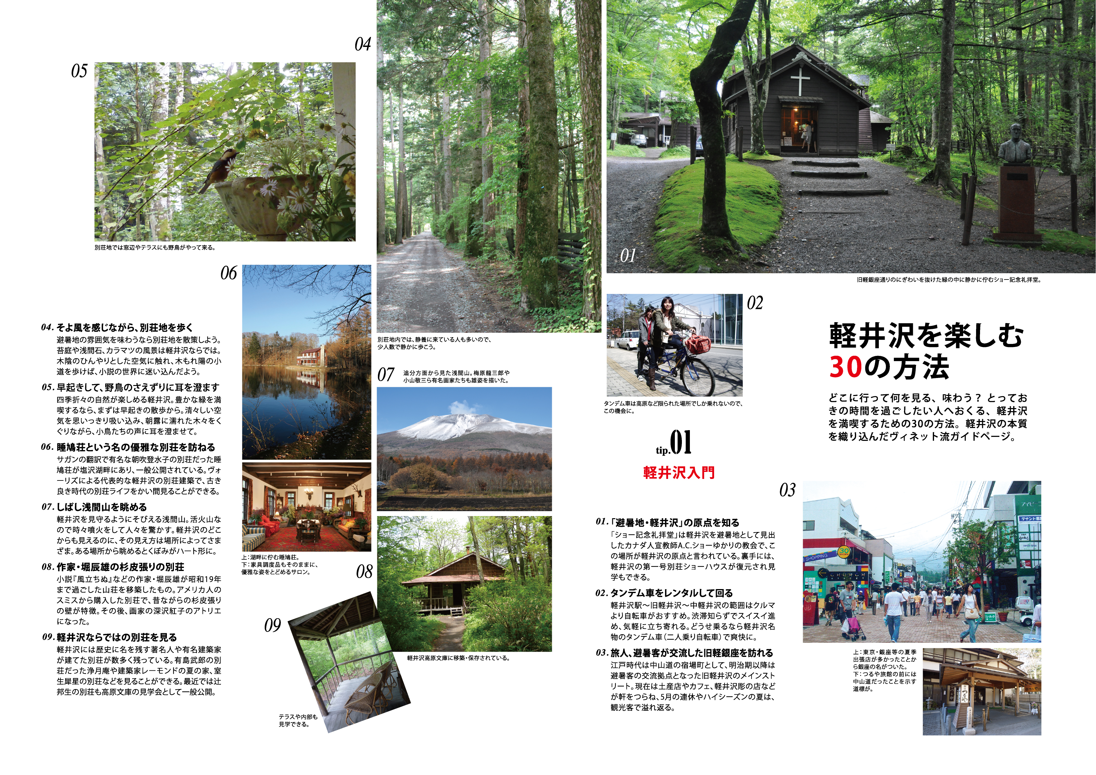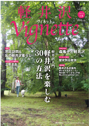 「ヴィネット」は英語で「言葉で描写する」「場面をとらえる」などの意味があります。軽井沢の自然、文化、歴史、別荘ライフの様々なシーンをヴィネットしています。ページをめくると、高原の爽やかな緑の風が薫るような、そんな”高原誌”です。著名人の別荘にお邪魔する「別荘訪問」や「別荘の食卓」など軽井沢の別荘ライフをテーマに軽井沢の衣食住を様々な切り口で紹介しています。