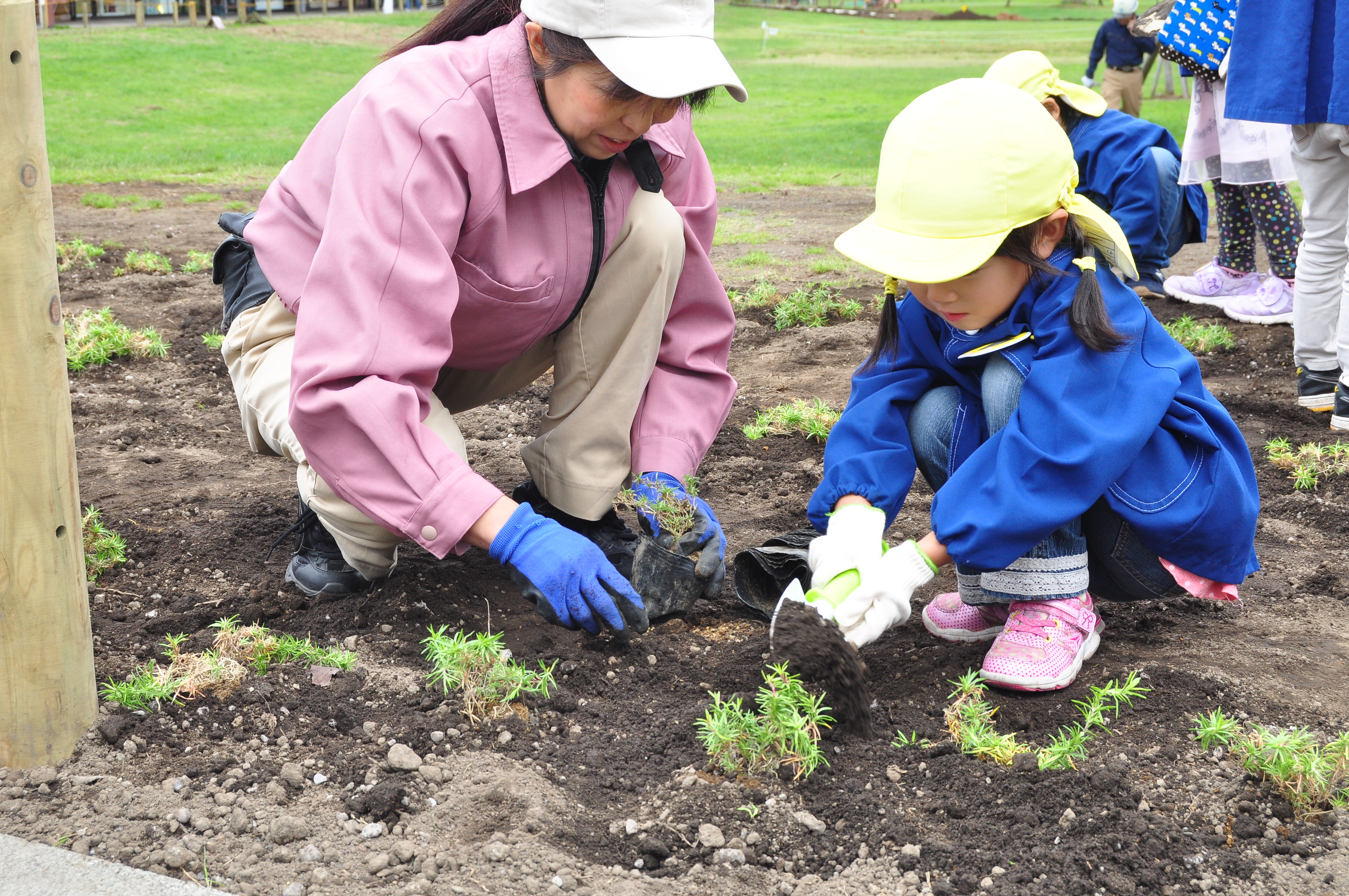 「白とピンクの花が芝生の緑に映えるようにと、芝桜を選んだ。最終的には全周370mの敷地に25,000株の芝桜を植える。。来年6月上旬頃には花を楽しめる予定」と納谷マネジャー。年長のたむらのぶひろ君(6歳)は、「穴を掘る時に力が必要だったけど、楽しかった。花が咲いたら幼稚園の友達と見に来たい」と笑顔で話した。