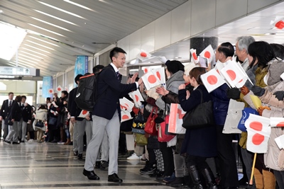2月9日に開幕する平昌冬季五輪に向けて、カーリング男子日本代表のSC軽井沢クラブは2月7日、15:55発の新幹線に乗り、軽井沢を出発した。駅の自由通路には約300人が見送りに集まり、握手やハイタッチで選手らを激励。スキップの両角友佑選手は「韓国で全力で戦って来ます」と意気込みを語った。小諸から見送りに駆け付けた軽井沢出身の親子は「SC軽井沢クラブは軽井沢の誇りです。平昌でも頑張ってほしい」と話した。