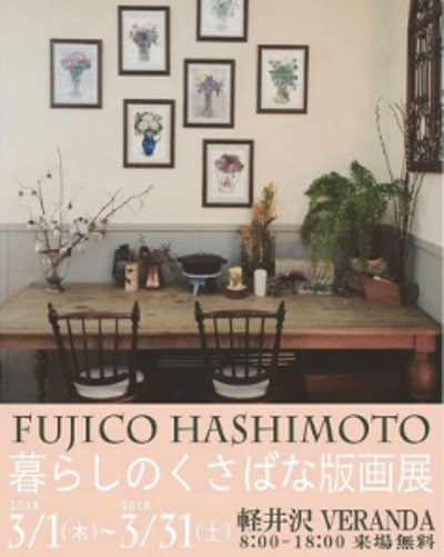 チャーチストリート1F、レストラン軽井沢VERANDAは3月1日~31日、水彩画家橋本不二子さんの作品展「暮らしのくさばな版画展」を開催する。昨年12月のオープン以来、作品展は同店初。期間中は来場者全員にウェルカムドリンクとしてオリジナルりんごジュースが振る舞われる。橋本さんの作品や、ポストカードの販売もある。