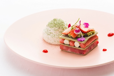 旬のフルーツをデザートコースで提供している星野リゾートで、この春味わえるのは「春の便りのデザートコース」。苺のデザートをフランス料理のフルコースに見立て、前菜・スープ・メイン・ミニャルディーズの4品で構成。品種豊富な苺を調理方法によって様々なデザートに仕立てた味わい豊かなフルコースを楽しめる。