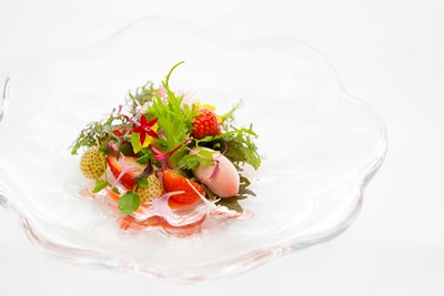 苺、ソルベ、ピクルス、ドレッシングでさっぱりと仕上げたサラダ仕立ての前菜。