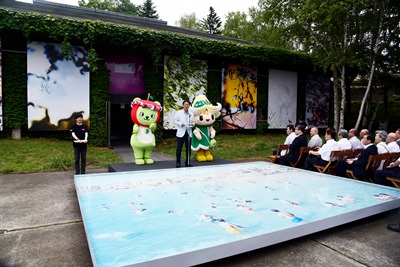 広告写真などの制作を行っているアマナは御代田町と8月11日から旧メルシャン軽井沢美術館周辺で国内最大級の写真の祭典「浅間国際フォトフェスティバル」を開催している。国内外のアーティストら28人の作品を約200点集め、屋内外に展示。車の中で撮影してポートレイトを印刷する「フォト・トラック」やパネルから顔を覗ける写真など家族連れでも楽しめる体験型の作品もある。11日に行われたオープニングセレモニーで御代田町長の茂木祐司さんは「写真をテーマとした街づくりで地域の活性化を図っていく。浅間山麓の魅力を世界に発信していきたい」と話した。