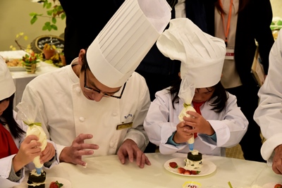 10月18日に行われたオープニングレセプションには参加店舗のパティシエや町長らが出席。ホテル音羽ノ森代表取締役の鈴木健夫さんは「スイーツには心をほっこりさせる力がある。スイーツの輪を広げていきたい」と挨拶。レセプションでは軽井沢東保育園年長の園児20人が町長やパティシエとケーキ作りを体験した。園児たちはほうれん草を練り込んで作ったスポンジに生クリームや苺、長野パープル、シャインマスカットなどを盛り付けて楽しんだ。