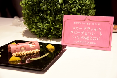 ホテルサイプレス軽井沢は今回が初参加。ナッツとドライフルーツを使用したアイスケーキを穴あきチョコレートで覆い、「見え隠れする恋の駆け引き」をイメージしたという。パティシエの古市智也さんは「昔の恋愛を思い出しながら食べてほしい」と話した。