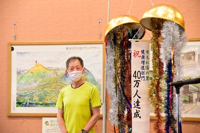 軽井沢町の保健福祉複合施設「木もれ陽の里」健康増進部門の利用者数が6月24日、40万人を突破し、セレモニーが開かれた。藤巻進軽井沢町長が、40万人目になった中軽井沢在住の佐藤逸郎さんに軽井沢彫のお盆を贈呈した。佐藤さんは今年で72歳。10年ほど前から毎週1~2回同施設に通い、筋力トレーニングをしたり、水曜日のからだづくり教室に参加している。「体力が維持できて、趣味の山登りに役立っています。40万人目になったのはラッキーでした」と喜びを語った。
