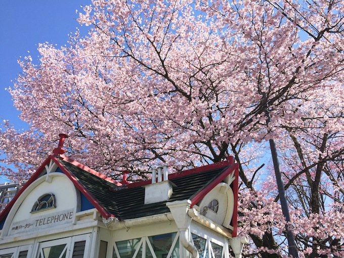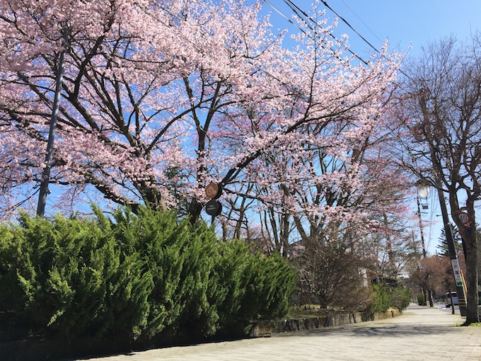 軽井沢本通りと離山通りが交わるロータリ―に咲くオオヤマザクラ。満開の時期がゴールデンウィークにずれ込むこともあり、多くの観光客の目に触れることに。