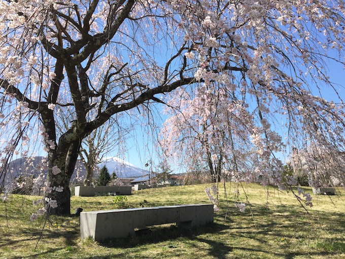 軽井沢大賀ホールの裏手にあるシダレザクラ。真下のベンチは、桜に包まれながら離山と浅間山も望める特等席です。ホール北側の小道も、桜が植えられています。