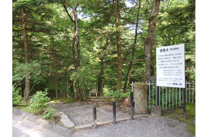 ゴルフ橋を渡り先に進むと、鹿島ノ森ホテル脇の御膳水から「お水端通り」になります。御膳水とは、この森の中の湧き水で、かつて宿場町を往来する旅人や武家諸大名などの御膳に使われたことが呼び名の由来です。明治天皇来軽の際も、この水を使った食事が供されました。