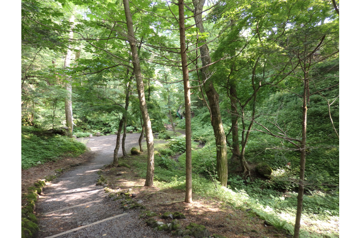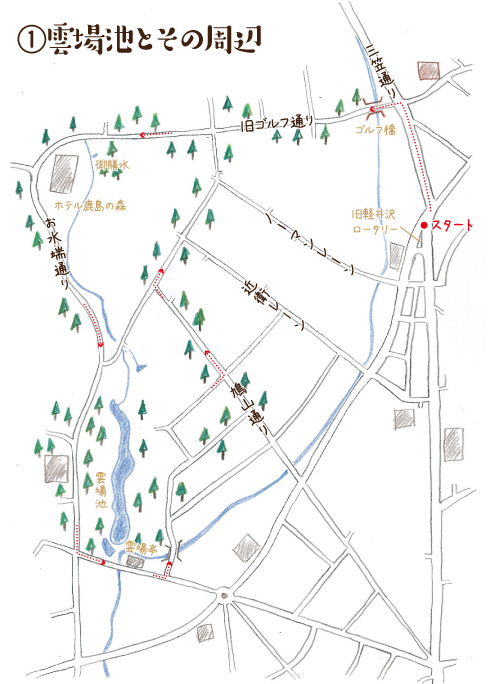 そのまま進み、四つ角を左へ曲がれば雲場池。外国人別荘客からはスワンレイクと呼ばれていました。周りには西洋風のロッジが建てられ、外国人のみならず日本の上流階級の避暑・社交の場としても賑わっていました。鮮やかな森の緑を楽しみながら、ゆっくり池を一周し道に戻りましょう。