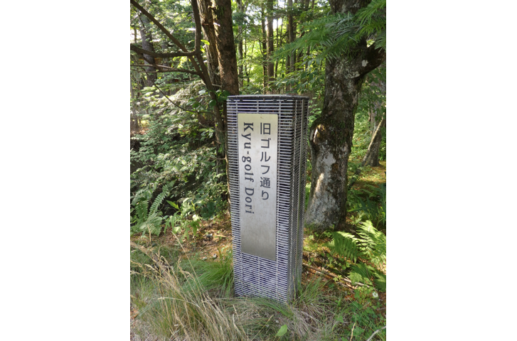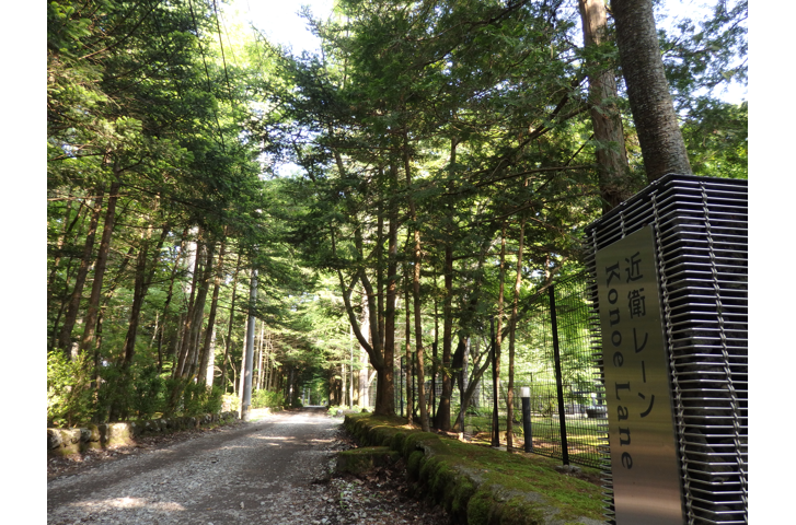 道を左へ進み、雲場亭を過ぎて左へ曲がり橋を渡ります。進んだ先の「鳩山通り」を左へ、次の角を右に進むと右手に「近衛レーン」「ノーマンレーン」と続きます。「鳩山通り」は、大正期より、政治家鳩山一族の別荘があることで知られ、「近衞レーン」は、戦前に首相を三度務めた近衛文麿の別荘があったところです。近衞は多忙な執務の合間をぬってここを訪れては、ゴルフや食事を楽しんだそうです。「ノーマンレーン」には、カナダ人宣教師ダニエル・ノーマンの別荘がありました。30年以上にわたり避暑客と地元住民との調整に尽くし、「軽井沢の村長さん」と呼ばれた人物です。