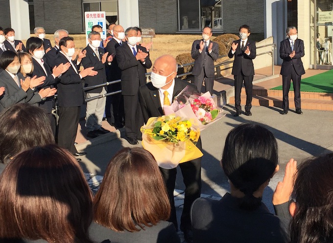 式終了後は、駐車場に集まった職員の拍手に包まれて庁舎を後にした。10日からは、土屋三千夫氏が新たに町長に就任する。